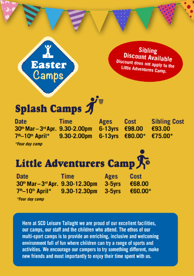 Spaces are limited and our Easter camps are always very popular, so early booking is recommended. Make this Easter break a memorable one and give your child an experience they’ll love at SCD Leisure TallaghtEaster Splash Camp 2026.