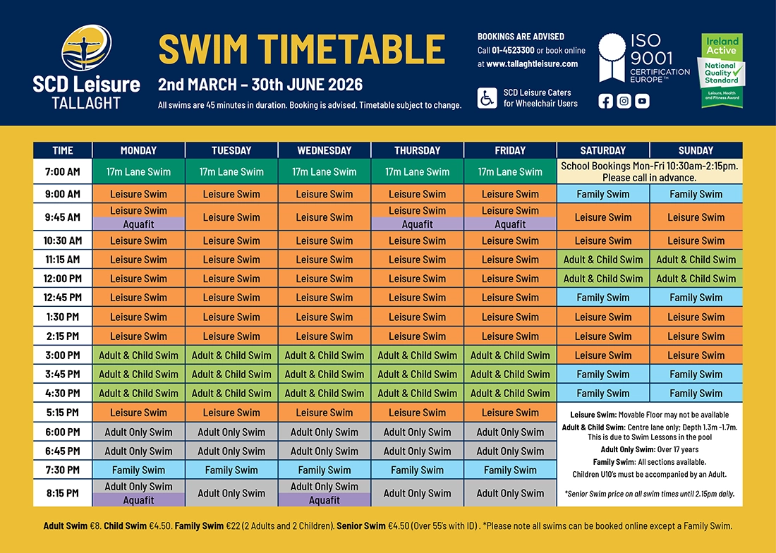 BOOKINGS ESSENTIAL VIA 01-4523300 OR ALTERNATIVELY ONLINE AT www.tallaghtleisure.com
